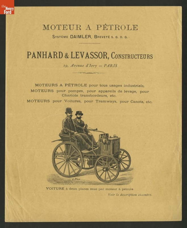 The French company Panhard and Levassor licensed Daimler engines. The company used the engines for a variety of purposes, but cars were the focus of this brochure. Starting with four identical cars built in 1891, Panhard and Levassor became the world's first automobile company in continual production.