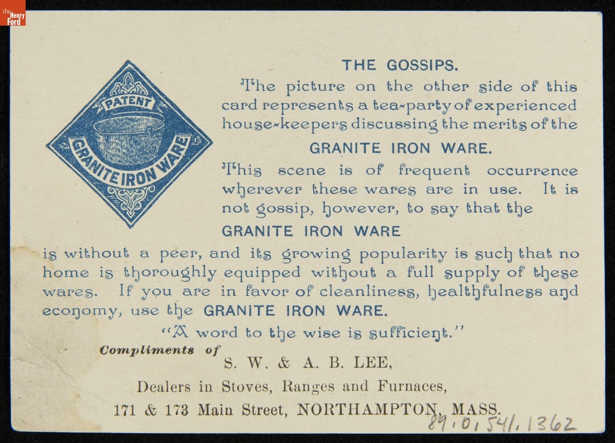 Trade Card for Granite Ironware, St. Louis Stamping Co., "All the Gossip," 1875-1880