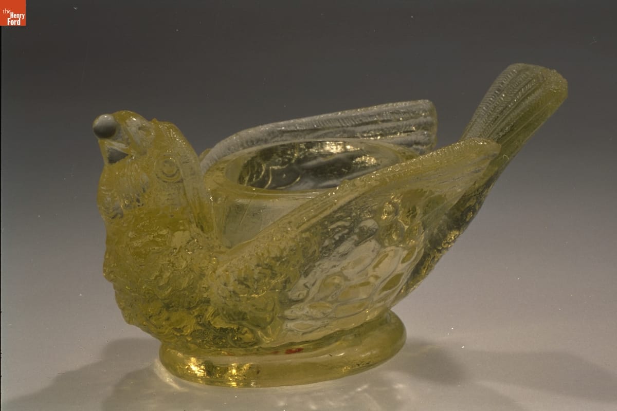 Small, open dishes filled with salt graced Americans' dining tables into the 20th century -- before the introduction of free-flowing salt and the acceptance of shakers. Diners usually found a large master salt near the head of the table or smaller versions closer to their plate. Novelty-shaped, pressed glass salts, like this bird with seed, appeared in the late 1800s.