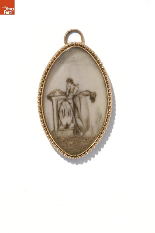 Before the 20th century, death came early and often. One way people coped was to wear jewelry as memorials to their loved ones. Over the centuries, mourning jewelry followed the prevailing fashions. Shortly after independence, Americans favored illuminated, miniature brooches and pendants painted on ivory. These featured shapes derived from classical design, symbols such as urns and weeping women dressed as ancient Romans.