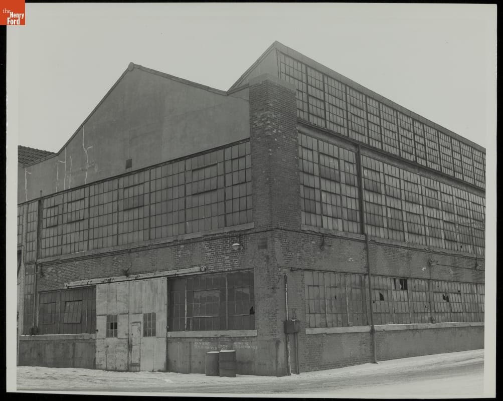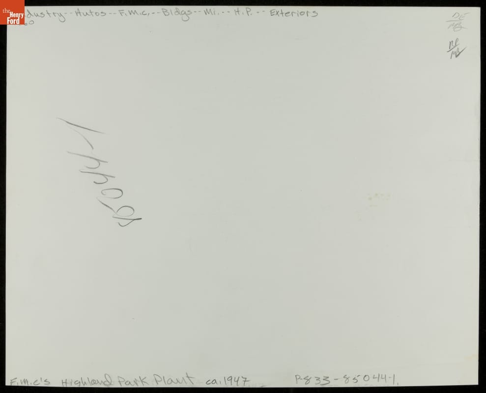This circa 1947 photograph shows the second production facility for Ford Motor Company's Model T -- the Highland Park Ford Plant, designed by renowned industrial architect Albert Kahn. It was here during the 1910s and 1920s that Henry Ford perfected the assembly line, instituted the Five Dollar Day, and became an international celebrity.