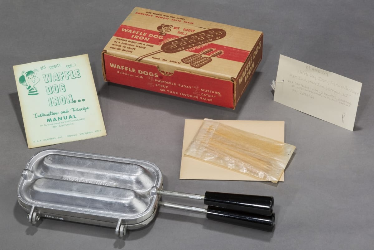 FOR YOUNG AND OLD ALIKE! / AMERICA'S NEWEST TASTE TREAT / HOT DIGGITY / DOG...! / WAFFLE DOG / IRON / WIENERS BAKED ON A STICK / IN DELICIOUS WAFFLE / BATTER TO CRISPY / GOLDEN BROWN / Patent No. 2696161