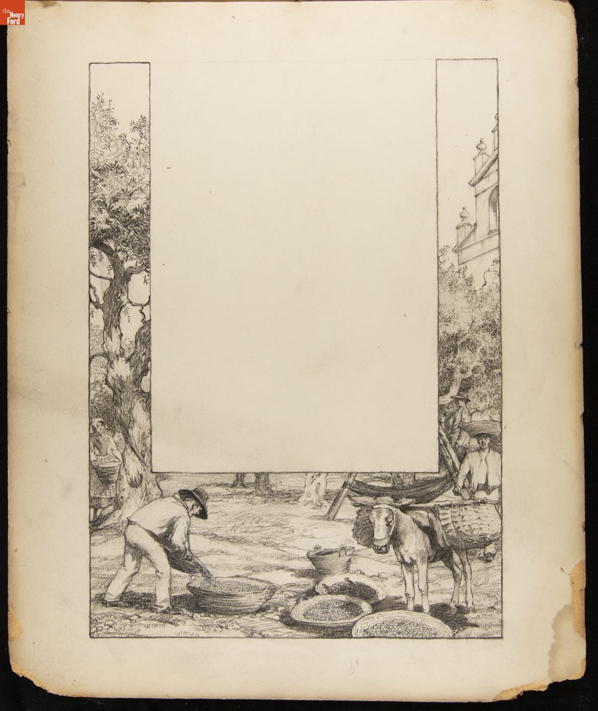 The H.J. Heinz Company published pamphlets, brochures, and booklets that detailed the company's history and manufacturing process. Sometimes, hand-drawn images accompanied text related to a specific topic. This advertising layout drawing of olive harvesters in Seville, Spain, was drawn for publication purposes and would have surrounded text related to Heinz's olive production in Spain.