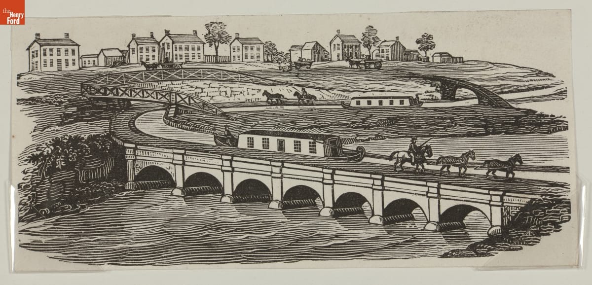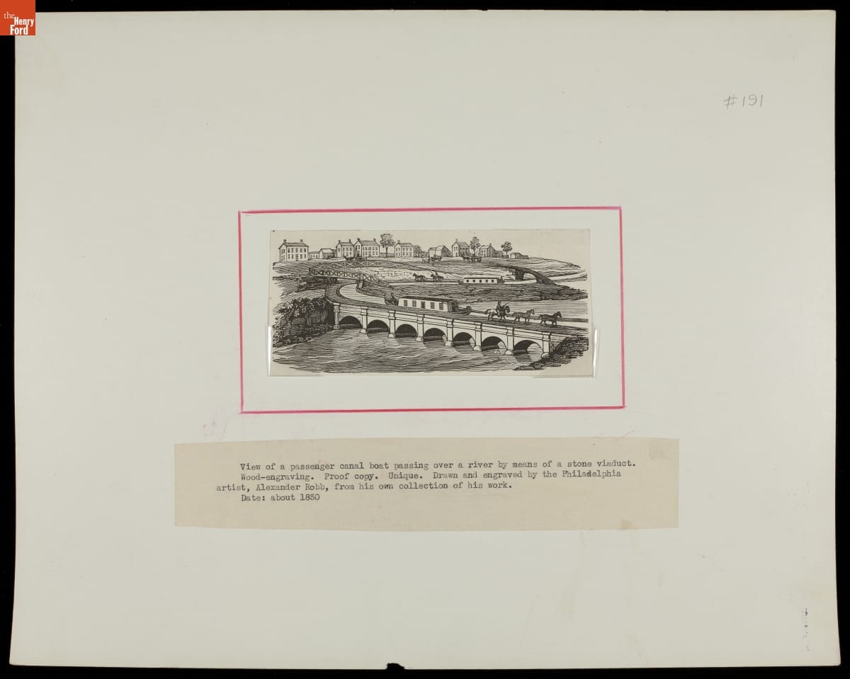 The first half of the 19th century was the heyday of canal construction in the United States. This wood engraving by Alexander Robb, a Philadelphia artist, illustrates a view of a passenger canal boat passing over a river by means of a stone viaduct, a familiar sight by 1830.