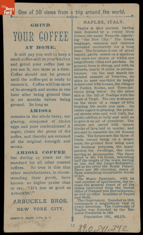 Trade Card for Ariosa Coffee, Arbuckle Bros., "Naples, Italy," 1891