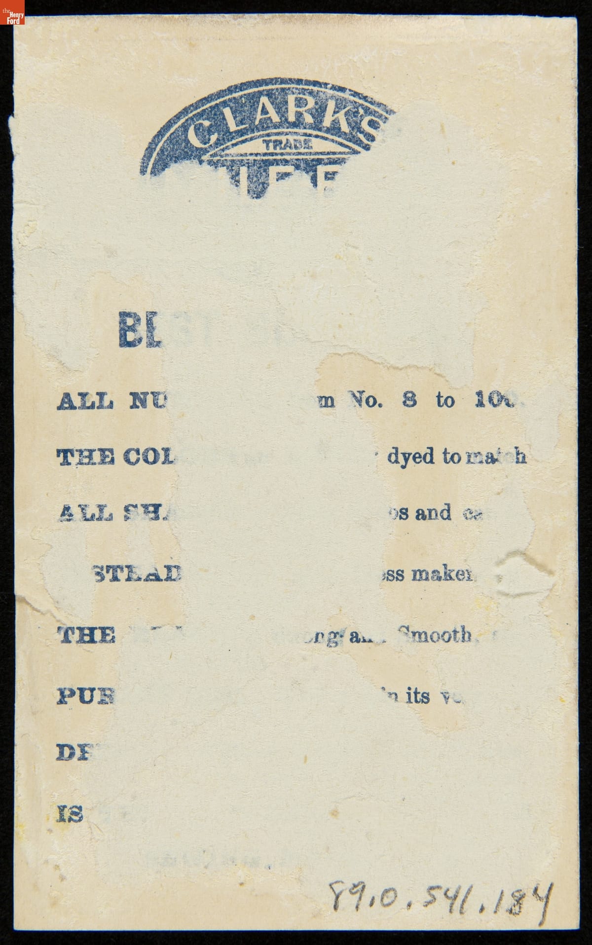 Products manufactured by Clark's O.N.T., Newark, New Jersey. Card printed by Donaldson Brothers, Five Points, New York.