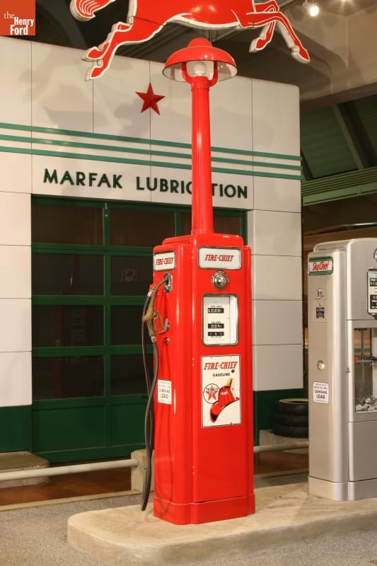 By the 1940s, drivers watched "computing" pumps like this Texaco Fire-Chief pump automatically calculate the amount of gasoline and the price. This type of pump did away with price charts used by service station attendants. Internal, calibrated gear sets turned numbered wheels allowing quick and easy fill ups and payments.