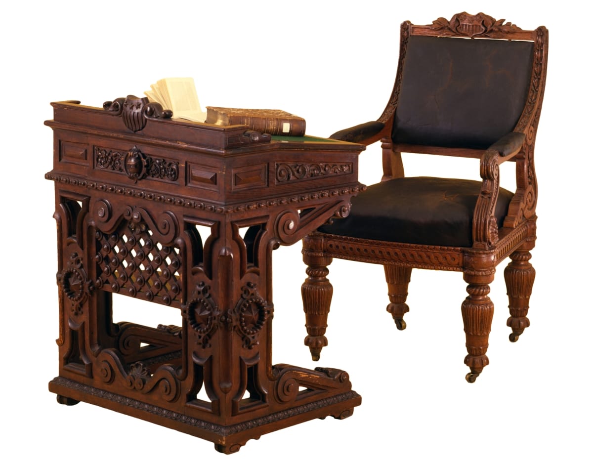Thomas U. Walter, Architect of the Capitol, designed chairs like this one for use in the U.S. House of Representatives in 1857. However, members of the House found these impressive-looking chairs uncomfortable. The chairs were replaced in 1859 -- many sold at auction. Photographers like Mathew Brady and Alexander Gardner obtained these chairs as studio props and they appear in images taken during the 1860s.