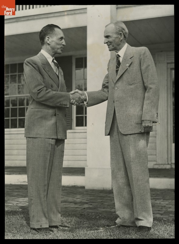 Edsel Ford and Henry Ford on Henry's 79th Birthday, Greenfield Village, 1942