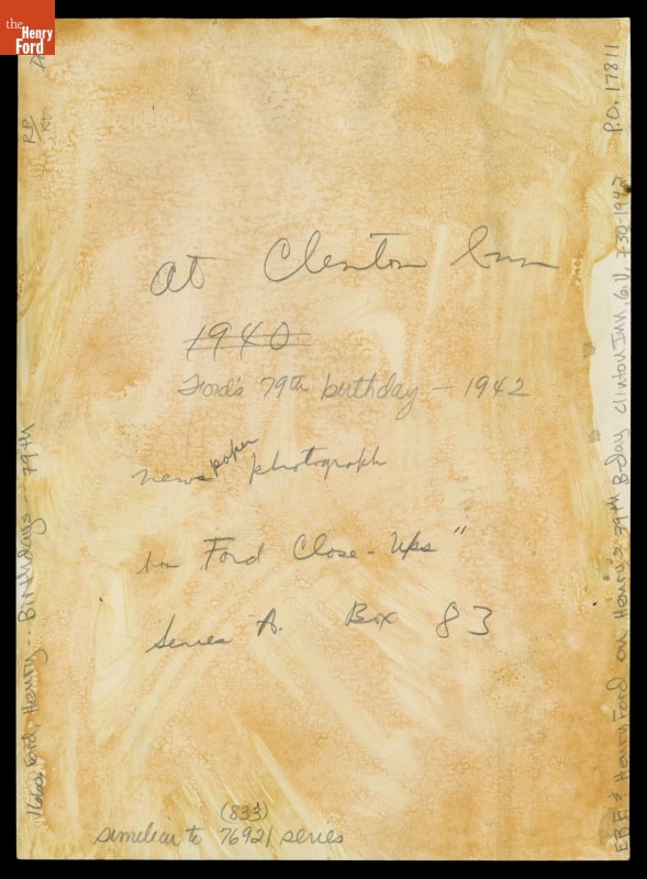 Henry Ford celebrated his 79th birthday with a favorite activity -- a visit to Greenfield Village. He was joined by his wife, Clara, son, Edsel, and several Ford Motor Company officials. The group enjoyed a meal at Clinton Inn (now Eagle Tavern) and attended a performance at Martha-Mary Chapel, where students of the Edison Institute schools presented Ford with a basket containing 79 yellow roses.