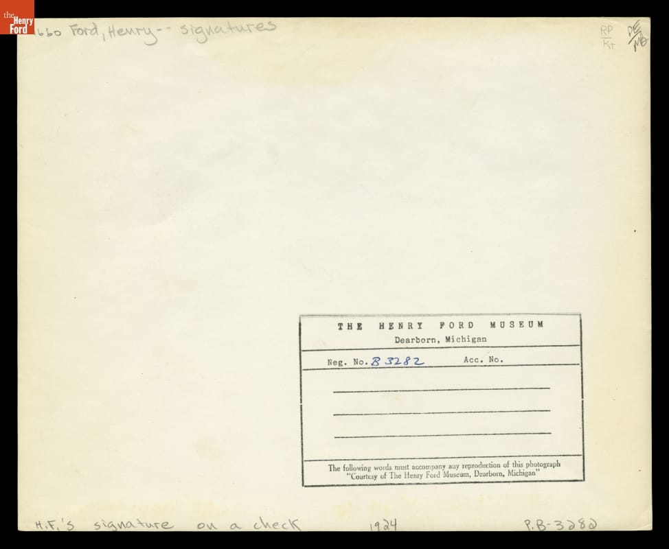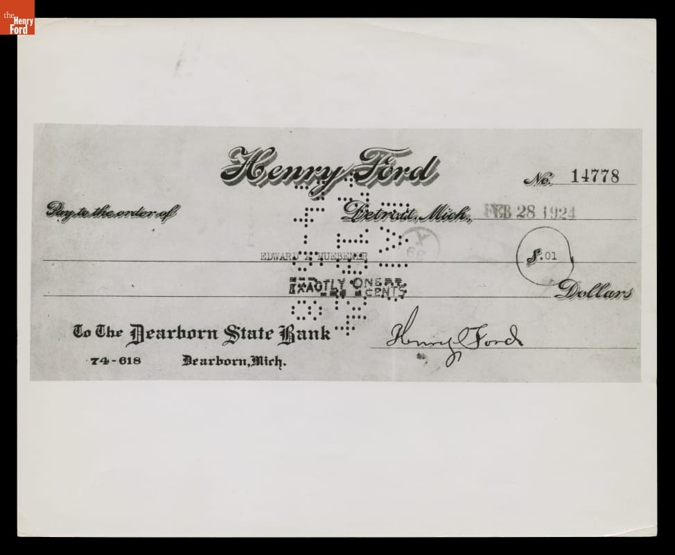 Check Signed by Henry Ford to Edward Huebener for One Cent, February 28, 1924