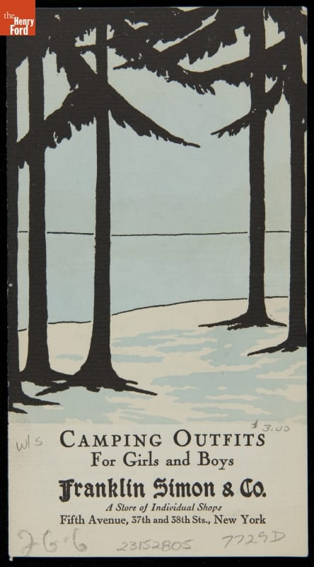 In the 1920s, many American children attended summer camps or participated in youth organizations that emphasized outdoor activities. To meet their needs, Franklin Simon & Company distributed this 1926 catalog featuring specialty "camping outfits for boys and girls." The New York City-based department store offered a variety of outdoor clothing and accessories, including hosiery, footwear, neckerchiefs, and pajamas.