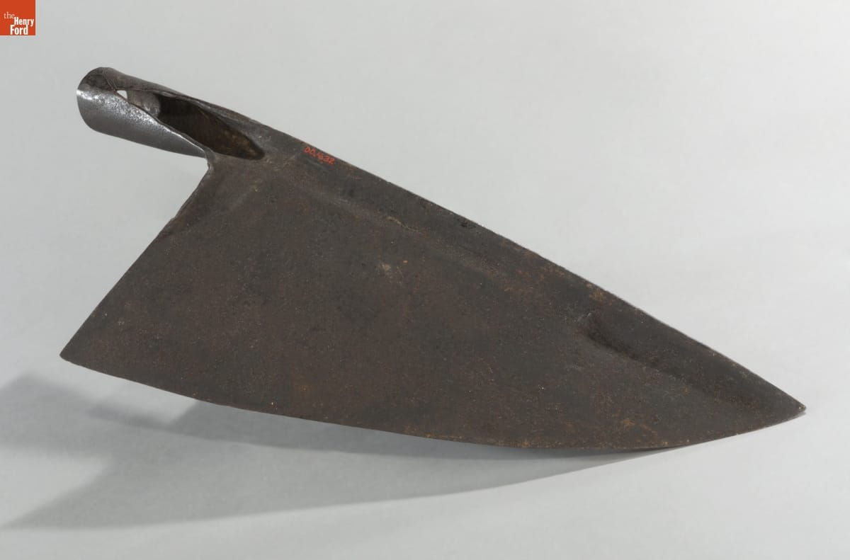 Farm families cut and cured enough grass each summer to feed hay to their livestock all winter. Stored hay settled over time and farmers used special knives to cut out chunks for feed. The blacksmith who forged this wrought-iron blade created a long cutting edge. They also forged a collar and groove on the backside of the blade to set and hold the wooden handle in place.