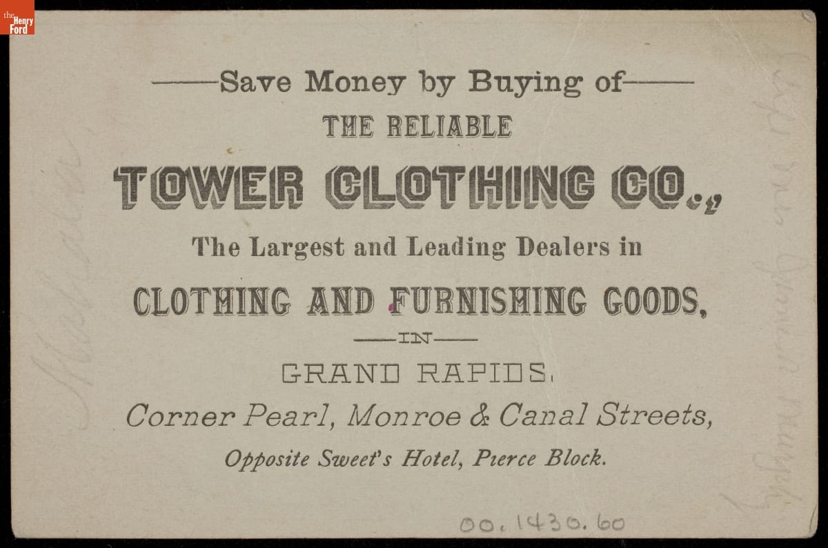 Card manufactured by Tower Clothing Company, Grand Rapids, Michigan.