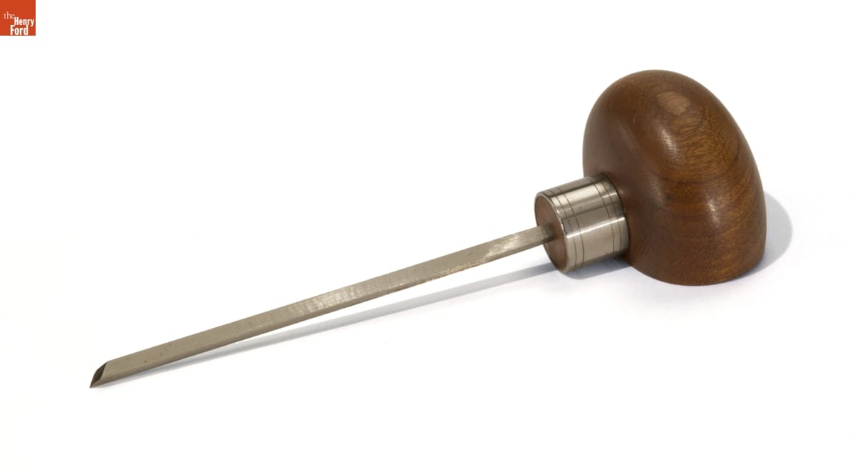 A clock and watchmaker uses a range of small hand tools to create or repair timepieces. Among this skilled craftsperson's many tools are files, saws, hammers, burnishers and gravers, like this one. A graver is generally used to shape metal components on a lathe. The graver's sharp edge cuts away unwanted material.