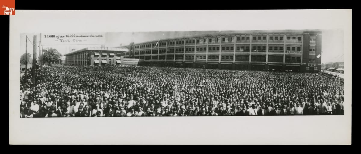 About 12,000 of Ford Motor Company's employees at its Highland Park plant posed for this photograph taken in 1913. Ford described it as the largest group photo ever taken up to that point -- and "the most expensive one, costing many thousands of dollars for employees' time and loss of production."