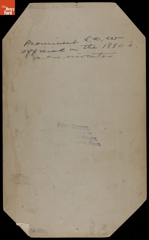 Stamp on back: ABBOT BASSETT, SECRETARY, L.A.W. / 221 COLUMBUS AVE., BOSTON, MASS.