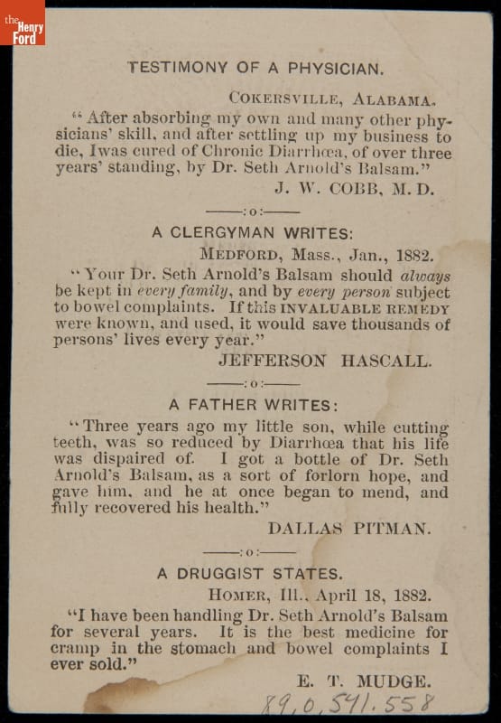 Trade Card for Dr. Seth Arnold's Balsam, circa 1882