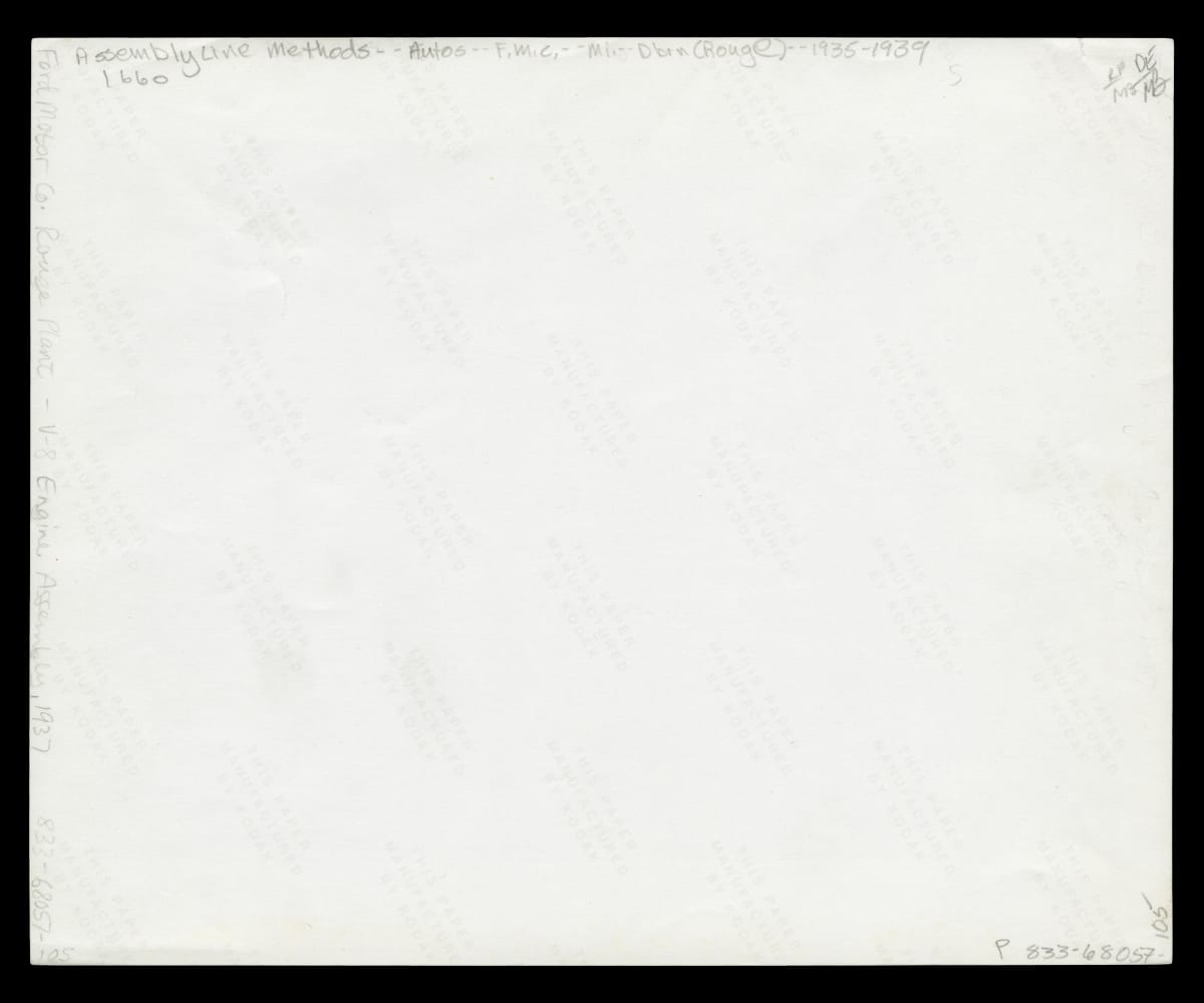Engineers at Ford's Highland Park plant had fine-tuned the moving assembly line. With this experience in hand, Ford created the "B" Building at its new River Rouge complex with extensive conveyer systems to accommodate the flow of parts and assembly processes. These line workers assemble Ford's radical V-8 engines, the first 8-cylinder engines available for inexpensive cars.