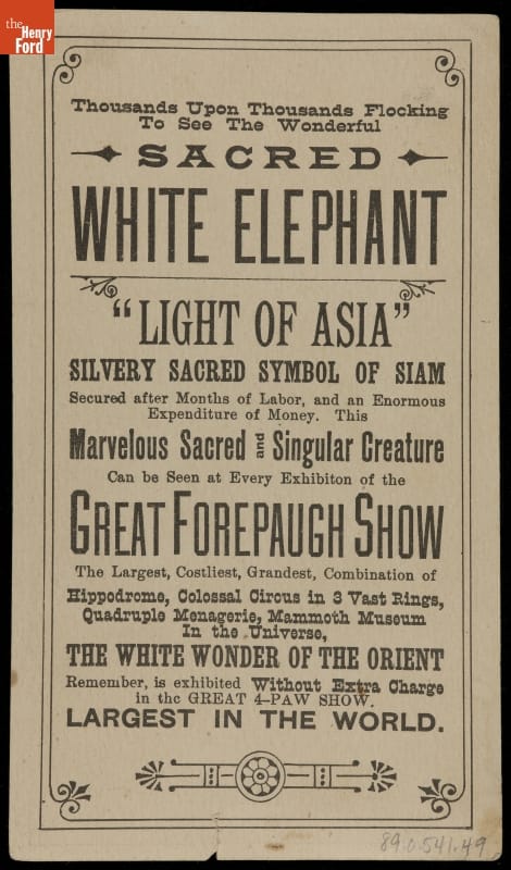 Advertisment for Adam Forepaugh & Sells Bros. Circus white elephant. Card printed by Courier Litho. Co., Buffalo, New York.