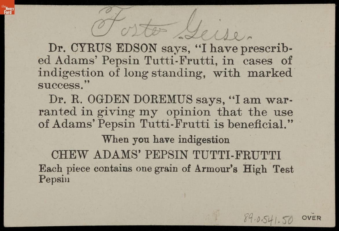 Trade Card for Adams' Pepsin Tutti Frutti, Adams & Sons Co., 1876-1900