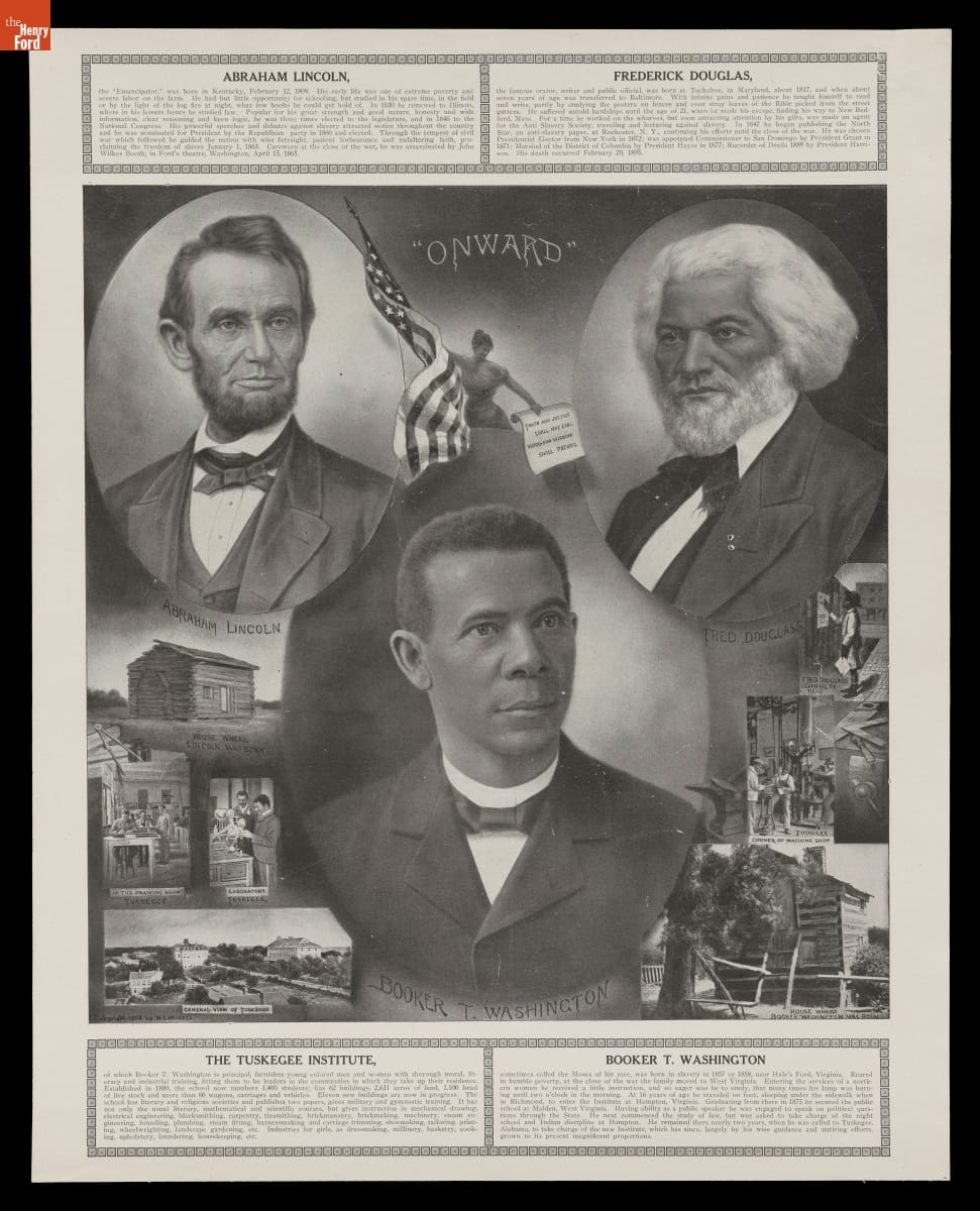This poster depicts three leading Americans who advanced African-American life at the turn of the 20th century. Frederick Douglass challenged slavery and worked for its abolition. President Abraham Lincoln signed the Emancipation Proclamation to preserve the Union by declaring freedom to slaves in rebel states. Booker T. Washington, leader of the Tuskegee Institute, promoted African-American rights through education and industry.