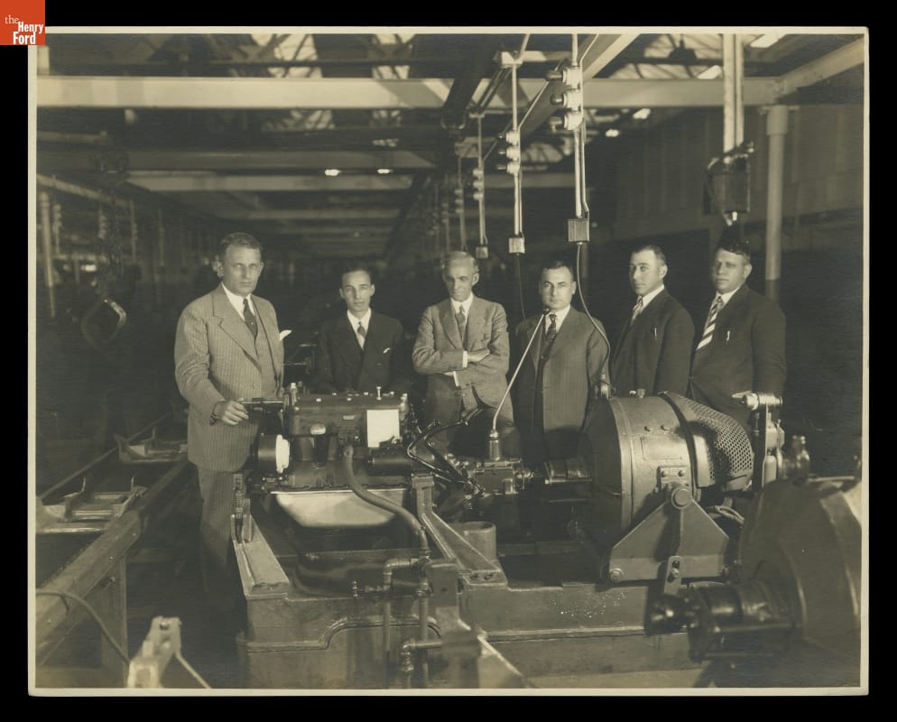 Henry Ford, Edsel Ford, and Ford Motor Company Executives with Model A Engine, October 1927
