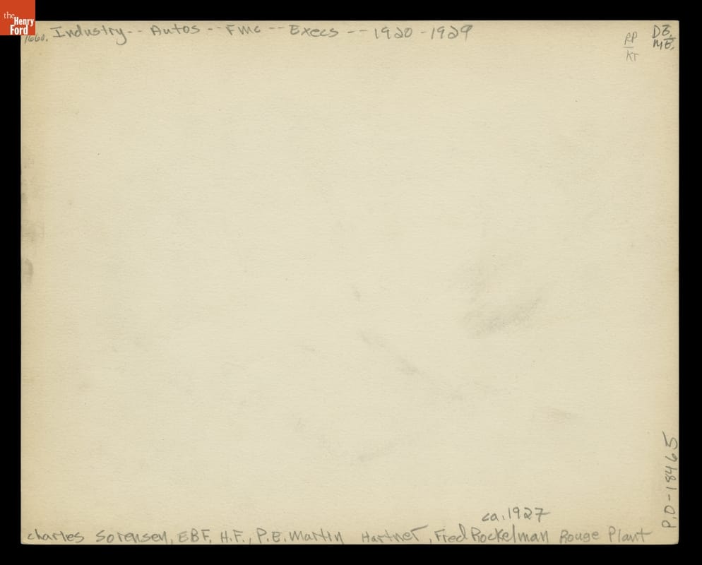 Henry Ford (center) and Edsel Ford (second from left) posed at the Rouge in 1927 with Model A engine number one, and with some of their most trusted lieutenants. Charles Sorensen (far left) and P.E. Martin (third from right) headed production at the factory. Gus Degener (second from right) supervised vehicle assembly and inspection. Charles Hartner (far right) oversaw machine operations at the Rouge.