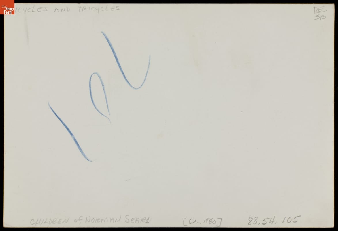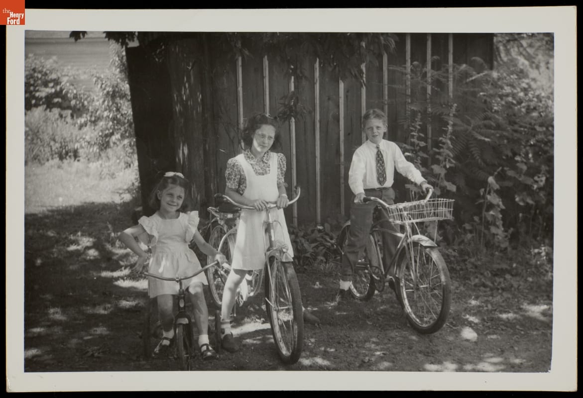 The Searl family children show off their bikes (and tricycle) in this photograph from about 1940. American kids used their bikes to do odd jobs, go to and from school, or travel the neighborhood with family or friends. Children's bikes tended to be heavy and stocked with gadgets and add-ons (like lights and baskets).