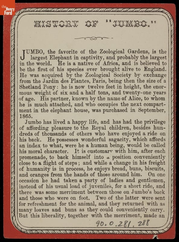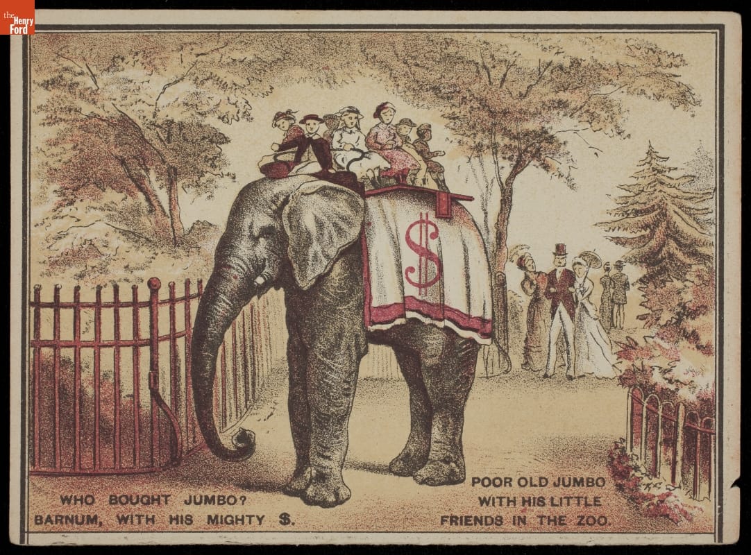 Showman P. T. Barnum purchased Jumbo, an 11-foot, 6-ton African elephant, from the London Zoo in 1882. Barnum shipped the giant pachyderm to America to star in his circus. Jumbo became a national sensation. Manufacturers and merchants capitalized on Jumbo's popularity by referencing the elephant in advertising materials like trade cards. This card, part of a series, depicts Jumbo giving rides at the London zoo.