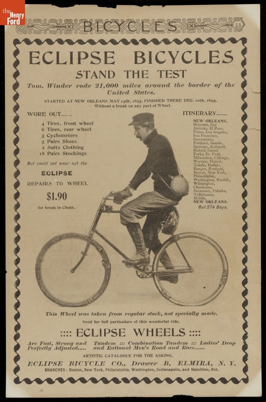 In 1895, Tom Winder pedaled around the border of the United States. His journey of more than 20,000 miles took 274 days. Winder rode a stock bicycle made by the Eclipse Bicycle Company. The company used Winder's feat to advertise the quality, strength, and reliability of its product.