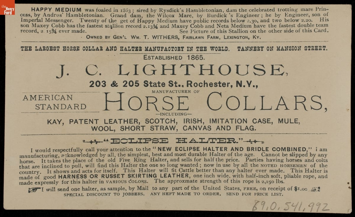 Trade Card for Horse Collars and "Eclipse" Halters, J. C. Lighthouse, 1884-1894