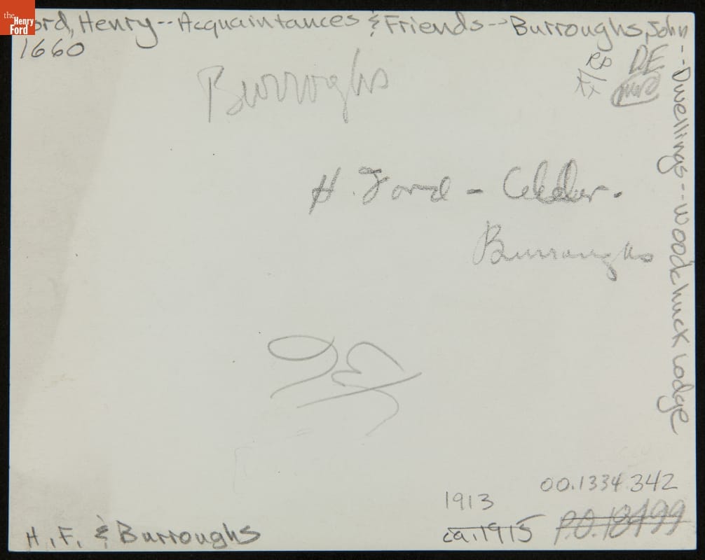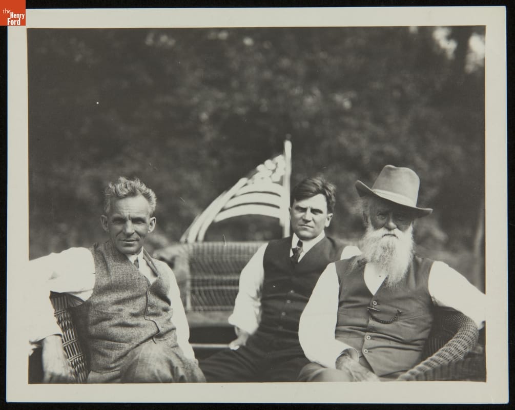 Henry Ford read and admired the works of John Burroughs. In the early 1910s, Ford sought out the internationally known naturalist and writer and the two became friends. Ford and Burroughs bonded over their love of birds and nature. They often visited each another and traveled together with mutual friends. This photo shows the pair with Glen Buck, editor of the Ford Times.