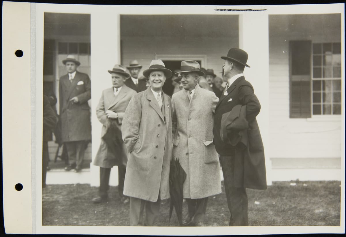 Frank Campsall, G.C. Osborn, and Matthew S. Sloan outside Eagle Tavern, October 21, 1929