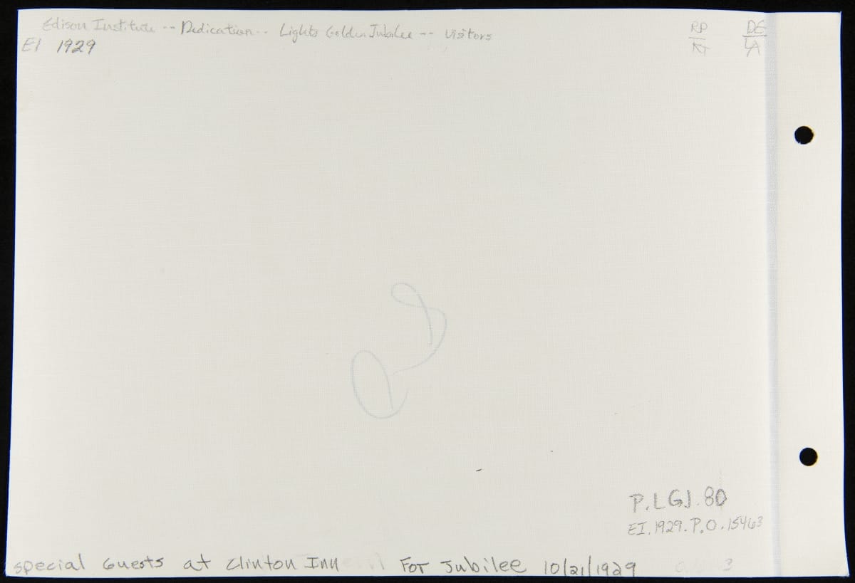 On October 21, 1929, Henry Ford hosted a celebration in Dearborn, Michigan, to honor his friend Thomas A. Edison. Known as Light's Golden Jubilee, the event commemorated the 50th anniversary of Edison's invention of a practical incandescent lamp. This photo shows Frank Campsall, Ford's personal secretary, standing with George Sloan, vice-president at Edison Lamp Works, and Matthew Sloan, president of New York Edison.
