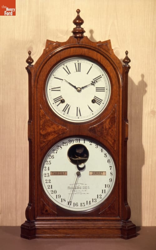 Case and calendar movement manufactured by Ithaca Calendar Clock Company, Ithaca, New York. Clock movement made by E.N. Welch Mfg. Co., Bristol, Connecticut.