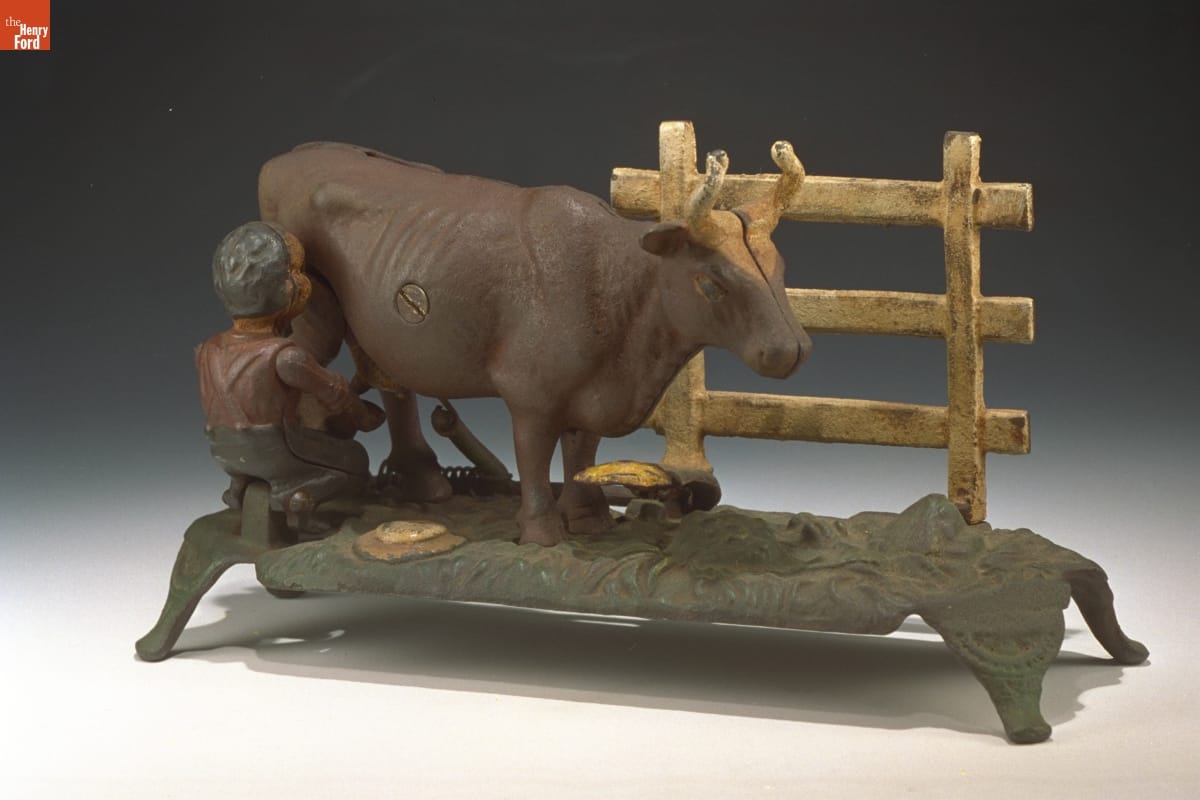 Saving money can be fun. Beginning in the late 1800s, families could purchase mechanical banks. These banks used ingenious mechanisms to deposit money. This bank depicts a man milking a cow. When the saver deposits a coin, the cow kicks -- a real hazard if the animal was treated roughly -- and the man tumbles backwards.