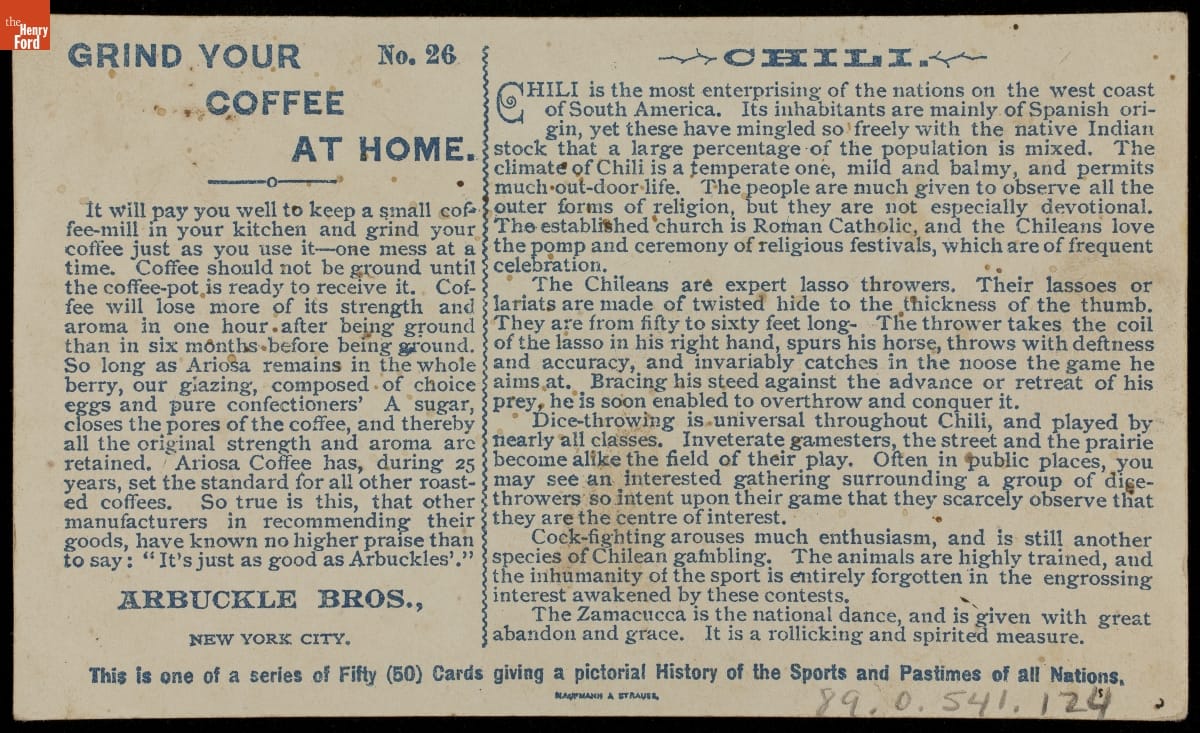 Grocers sold coffee in bulk when John and Charles Arbuckle came up with an innovative process for individually packaging different grades of coffee. Their popular Ariosa coffee beans were glazed with a sugar and egg coating supposedly to improve quality and flavor. This trade card, from the Chicago Columbian Exposition, was in a series depicting different nations' sports and pastimes.