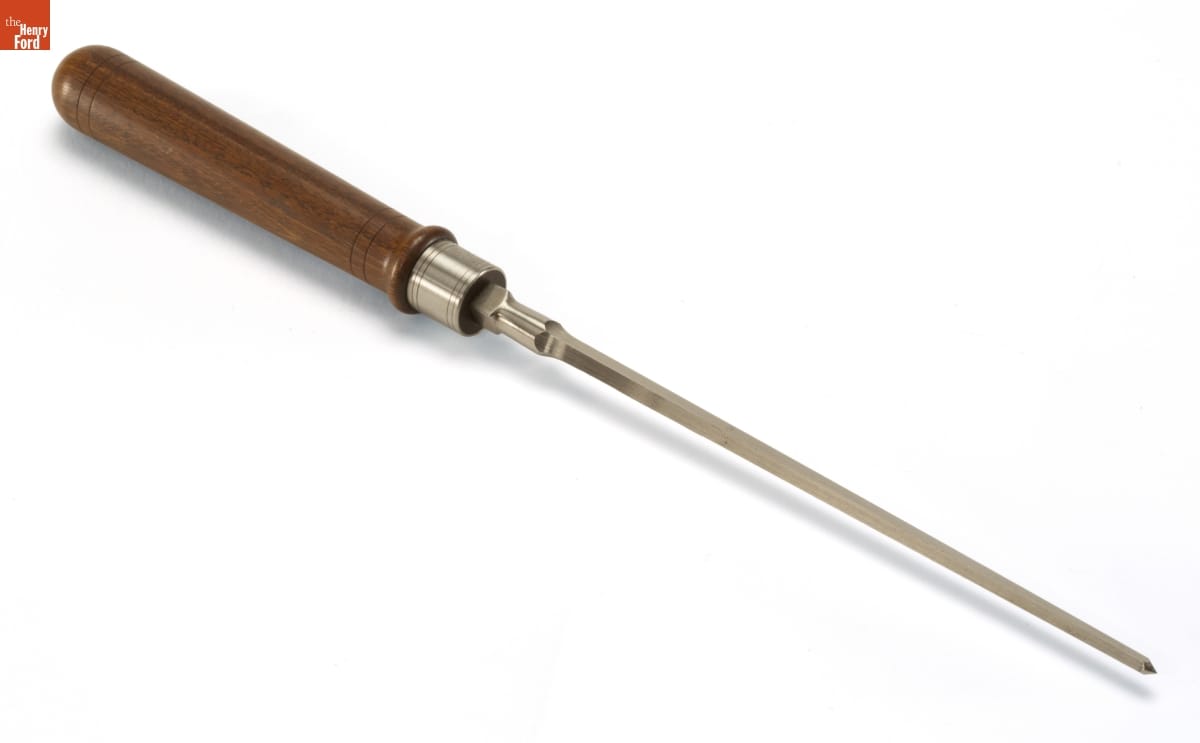 A clock and watchmaker uses a range of tools to create and repair timepieces. Among this skilled craftsperson's many tools are files, saws, hammers, burnishers and reamers, like this one. Reamers are used to enlarge existing holes in metal watch and clock parts.