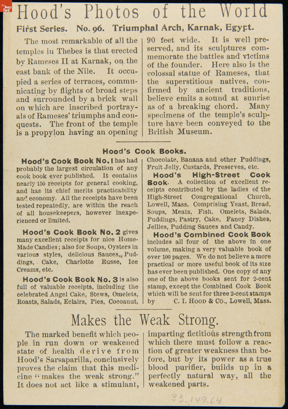 Trade Card for C.I. Hood & Co. with Hood's Photos of the World, "Triumphal Arch, Karnak, Egypt," 1890-1910