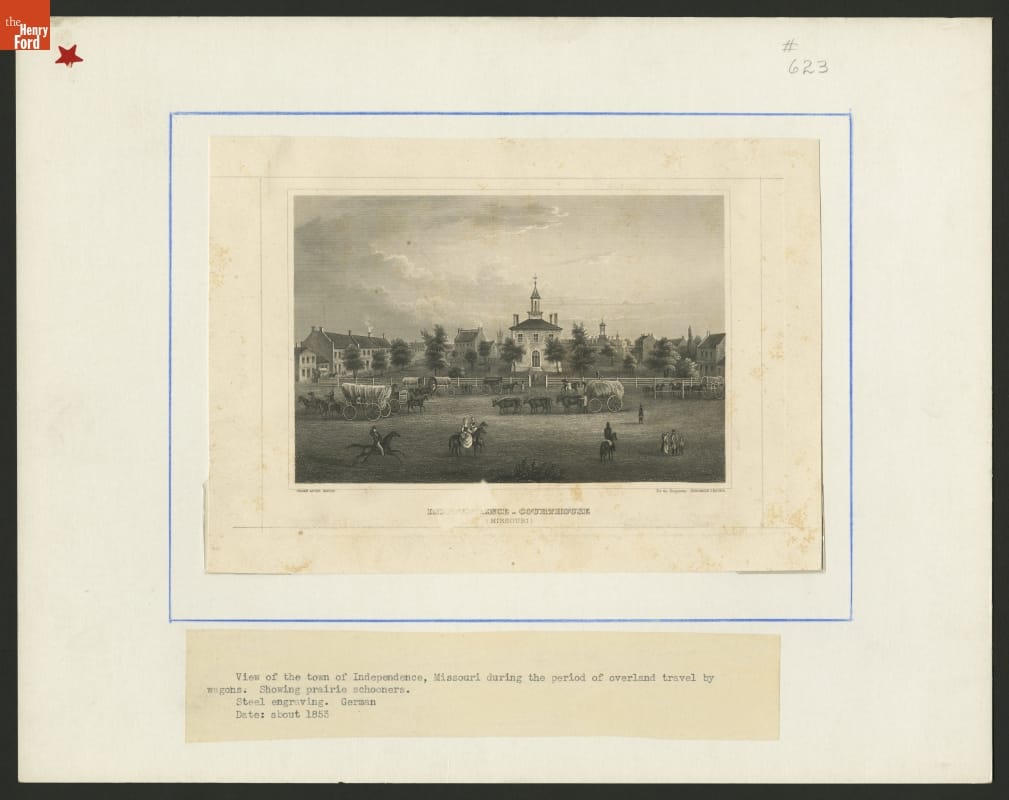 Independence, Missouri, was the principle "jumping off" point for the American frontier during the mid-1800s. Emigrants traveling on the Santa Fe, Oregon, or California trails began at or passed through Independence. This engraving shows wagons loaded with supplies in front of the town's courthouse as settlers prepare to migrate west.