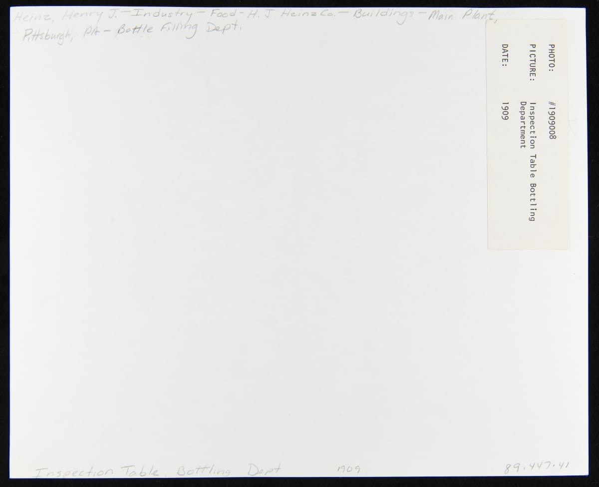 Before complete mechanization of the manufacturing process, many tasks at the Heinz factory were done by hand. The H. J. Heinz Company documented the many departments of the manufacturing process through photographs. This photograph shows products being inspected by designated employees to ensure products met certain standards before being packed and shipped.