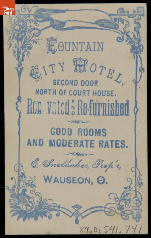 Advertised Fountain City Hotel, owned by Eli Snelbaker, Wauseon, Ohio