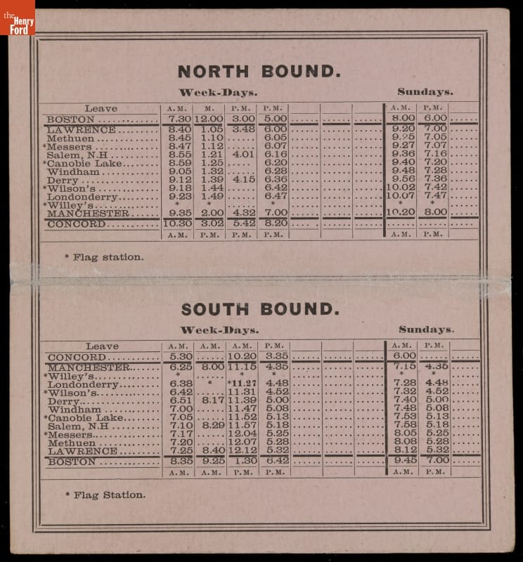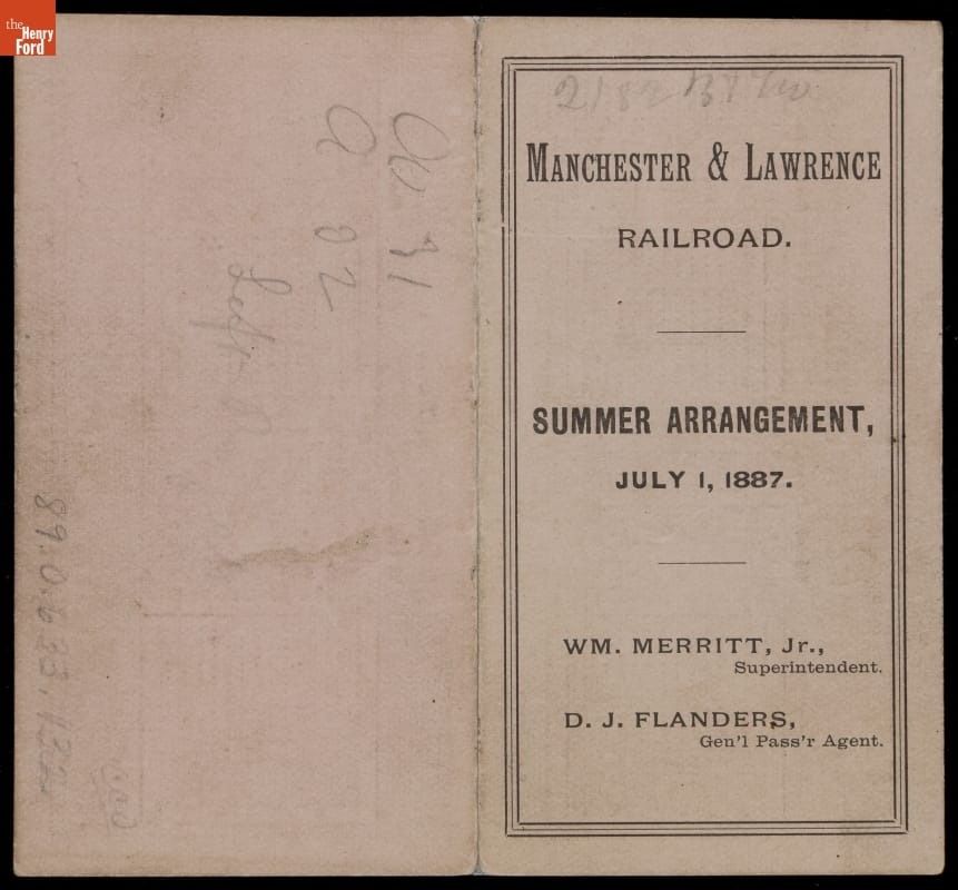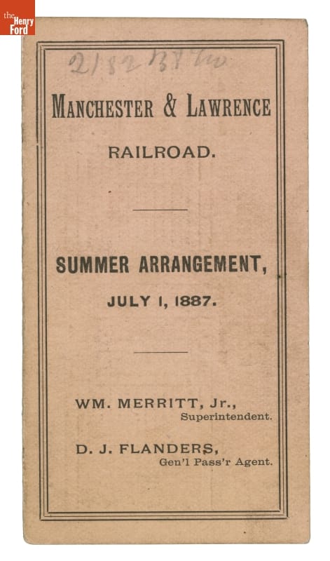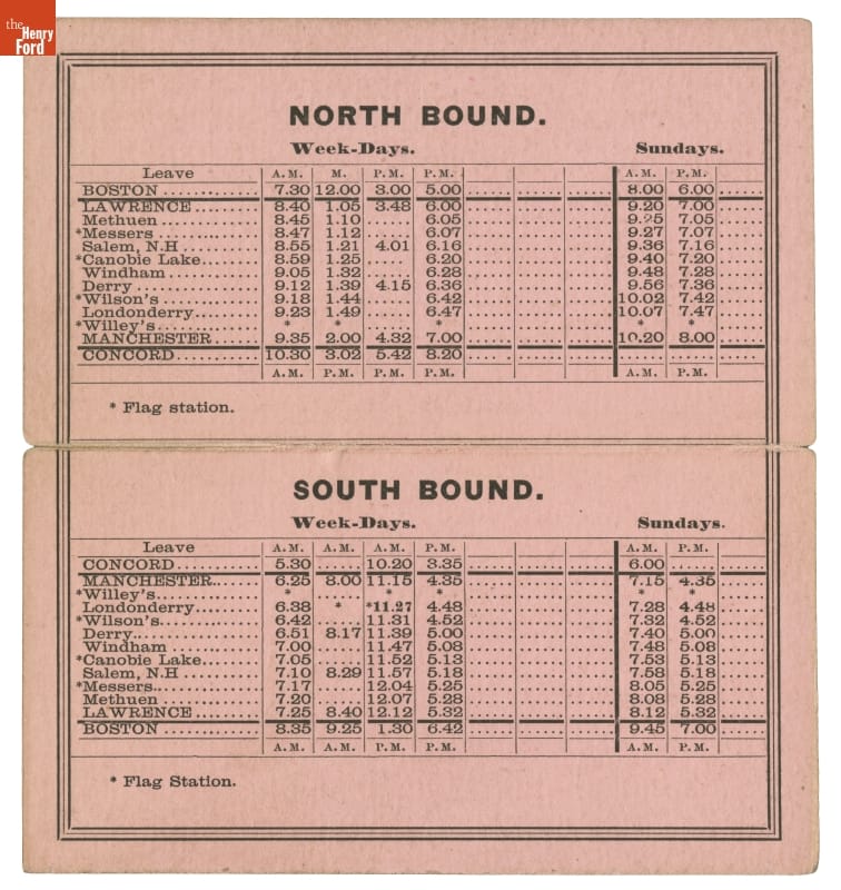 In 1887, The Manchester & Lawrence Railroad ran between Boston, Massachusetts, and Concord, New Hampshire, making numerous stops in Boston suburbs. Rail commuters traveled at standard, scheduled times from one city to another to work, shop, or visit. This schedule helped commuters plan their travels.