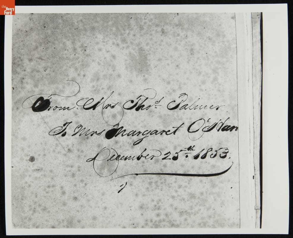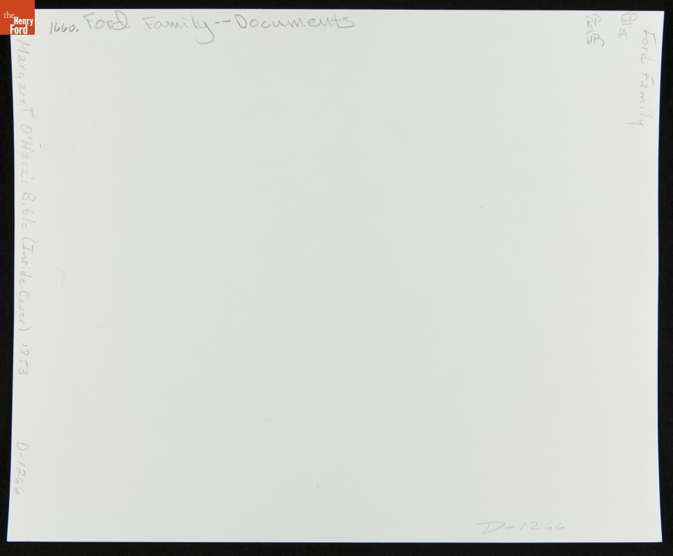 Margaret Ahern (or O'hern), Henry Ford's foster grandmother, received this bible as a Christmas gift from her friend Mrs. Thomas W. Palmer. Margaret Ford, Henry's sister, inherited the bible, and years later, she gave it to Henry when he was restoring the Ford home. The bible contains pages for recording significant family events. Ford family births, marriage and deaths were documented.