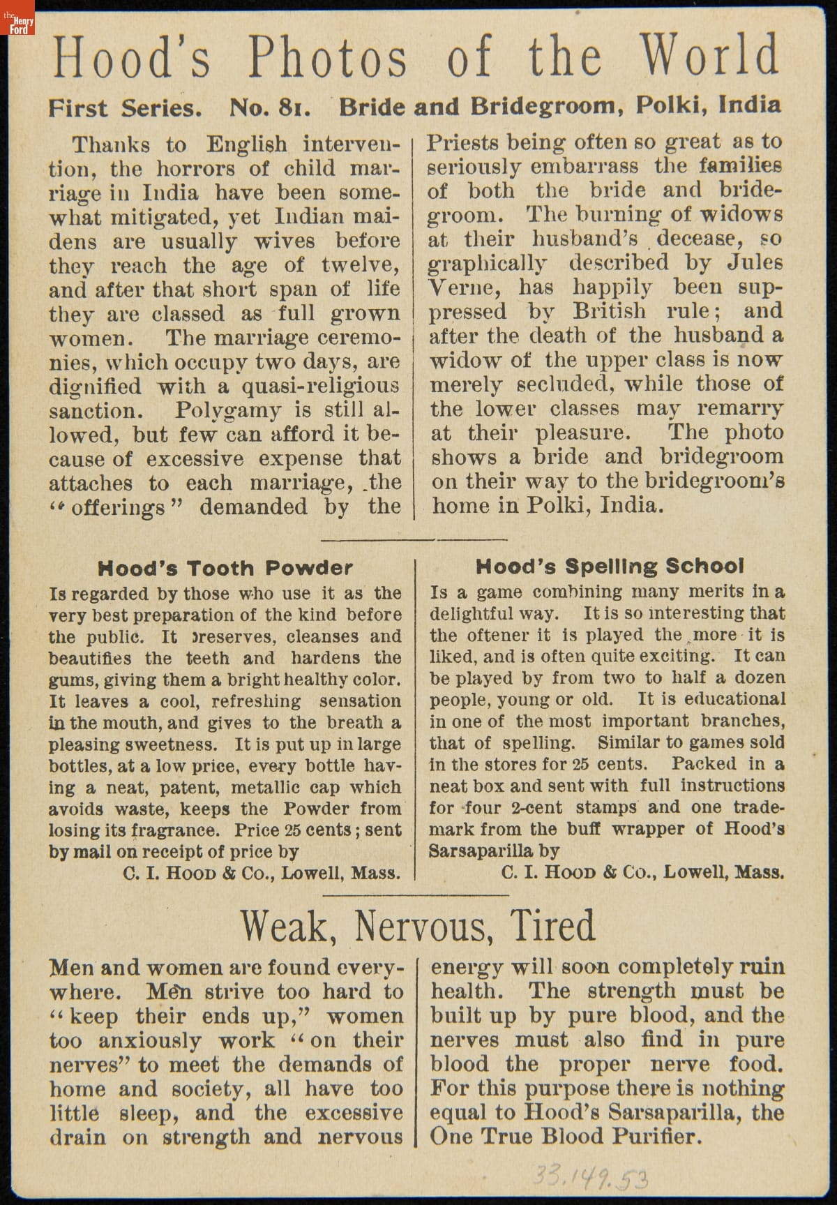 In the late 19th century, trade cards were a major means of advertising goods and services. Patent medicine producer, C.I. Hood & Co., had its own advertising department, creating cookbooks, calendars, and, most abundantly, trade cards. The trade card series, "Hood's Photos of the World," became popular among consumers, as it offered views of far-away places, providing a window to the broader world.