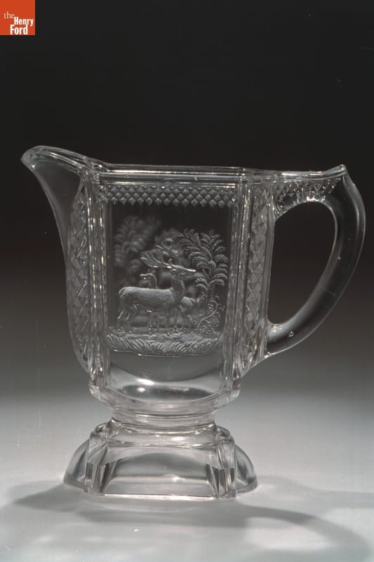 Middle-class Americans in the late 19th century arrayed their dining tables with affordable pressed-glass tableware. These items, usually sold in sets, came in a wide variety of patterns, colors, and styles. These decorative pieces -- like this cream pitcher -- communicated a family's status and taste to visitors and guests.