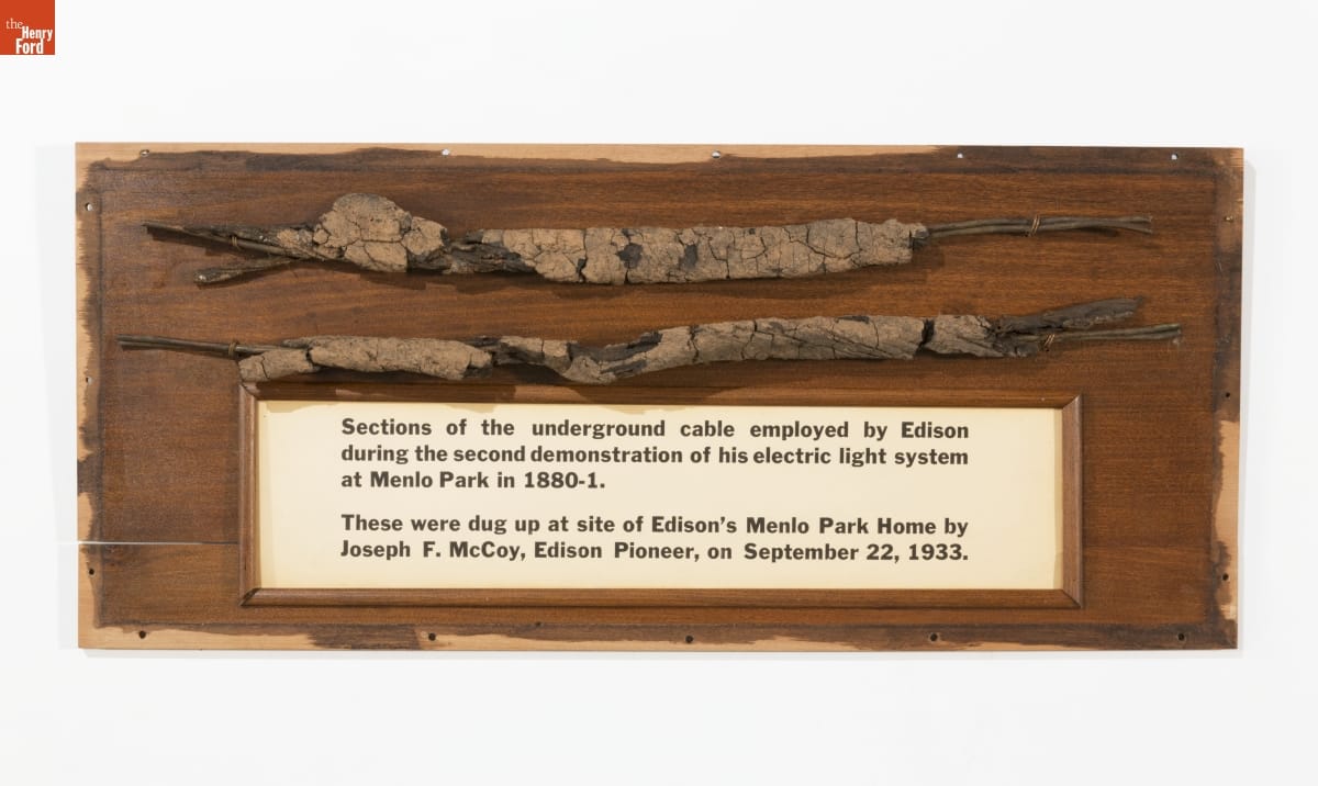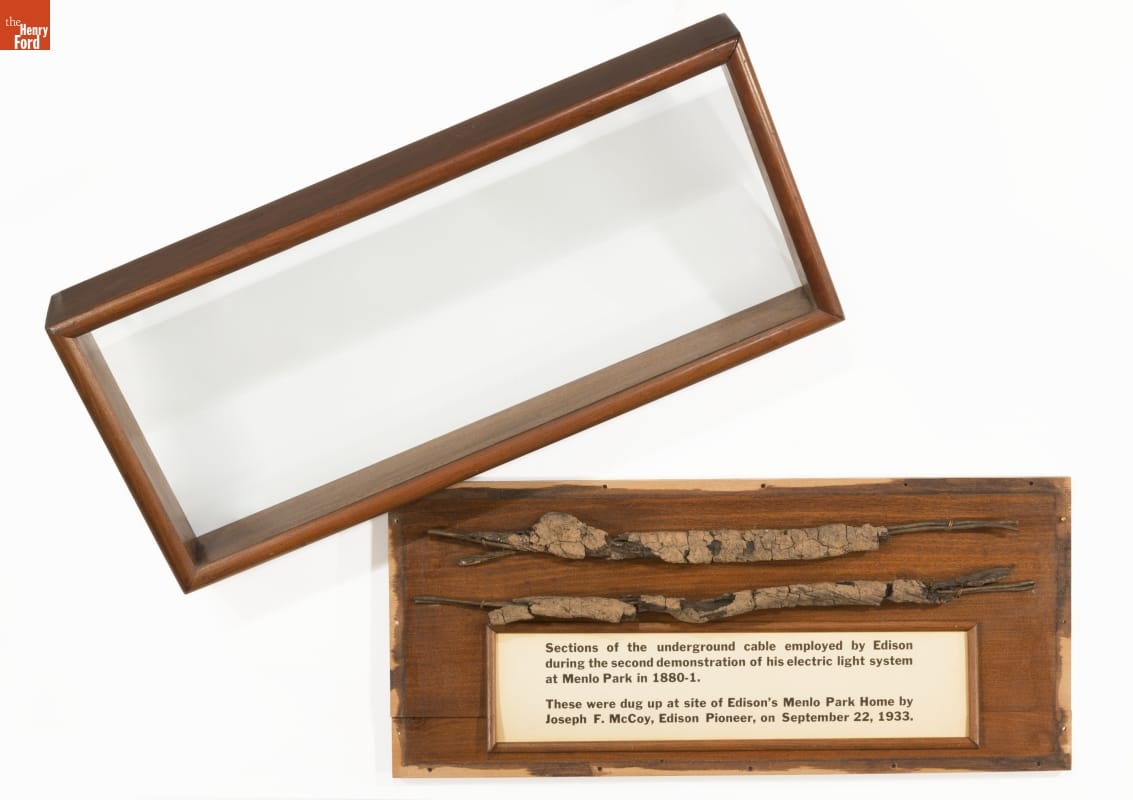 Sections of the underground cable employed by Edison during the second demonstration of his electric light system at Menlo Park in 1880-1. These were dug up at site of Edison's Menlo Park Home by Joseph F. McCoy, Edison Pioneer, on September 22, 1933.