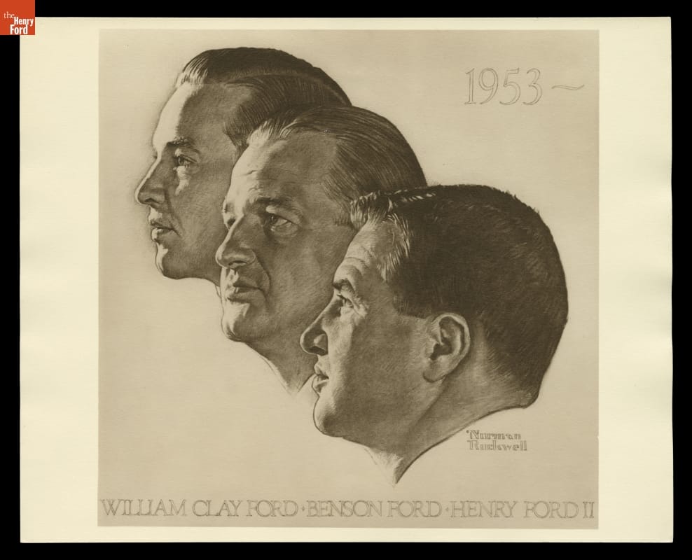 Norman Rockwell commemorated the 50th anniversary of Ford Motor Company's founding with a group portrait representing the automaker's third generation of Ford family leadership. Edsel Ford's three sons -- Henry Ford's three grandsons -- are shown in profile. From bottom to top: Henry Ford II (1917-1987), Benson Ford (1919-1978) and William Clay Ford (1925-2014).
