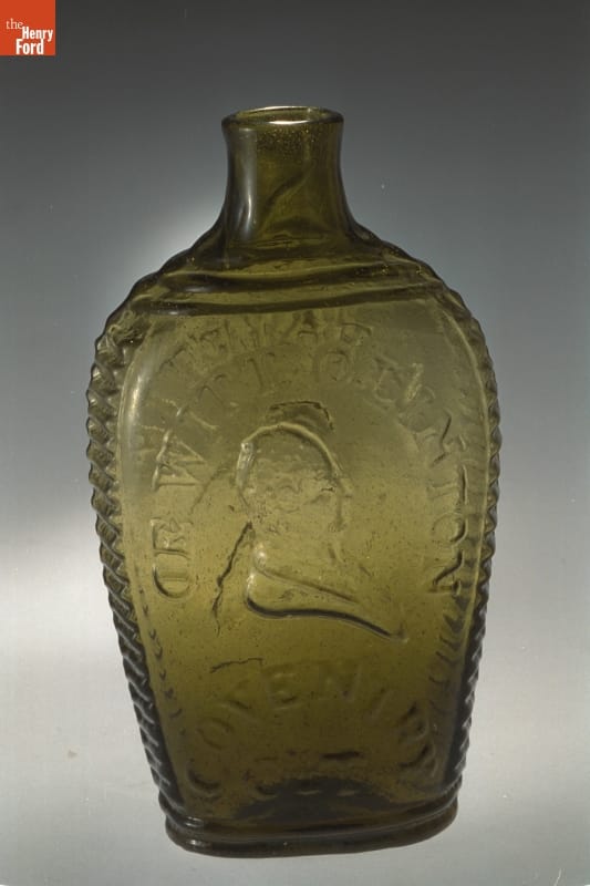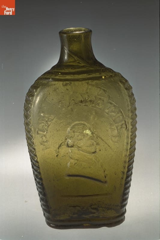 Glass factories in America began producing inexpensive, mold-formed flasks in the early 1800s. These figured flasks, often decorated with symbols of national pride, appealed to America's common man. This early 1820s flask contains images of two historic figures: General Lafayette, a French aristocrat who helped America win its independence; and DeWitt Clinton, the New York governor who supported construction of the Erie Canal.